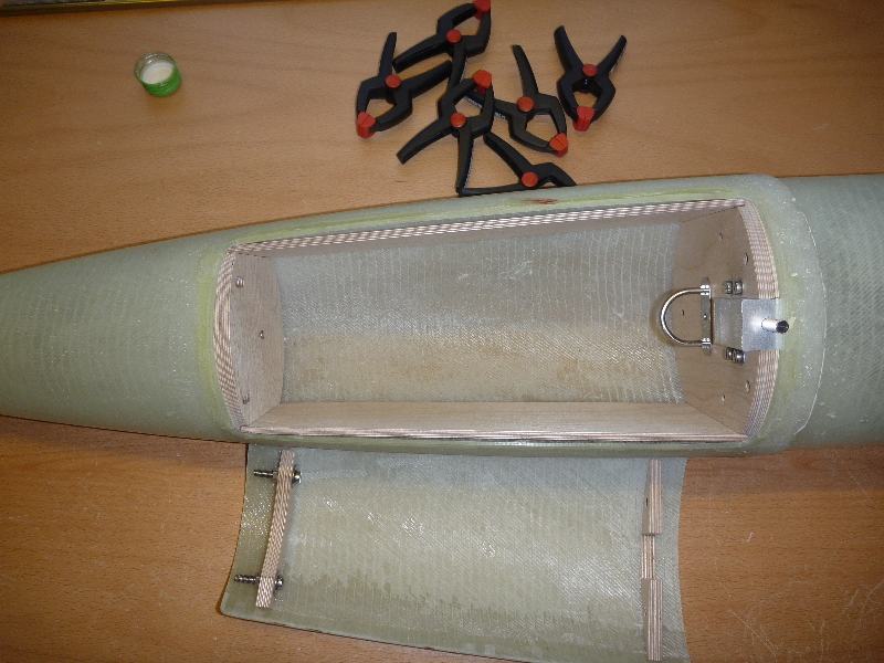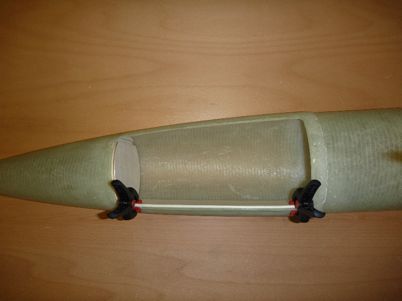 Die Klappe für den Hauptfallschirm hab ich mit dem Dremel per Hand rausgeschnitten. Ziemlich schief und krumm ist der Ausschnitt daher, und das Spaltmaß viel zu groß. Damit die Klappe später auch schön passt, habe ich auf die Kanten des Ausschnitts GFK-Leisten geklebt. So kann dann die Klappe genau angepasst werden: