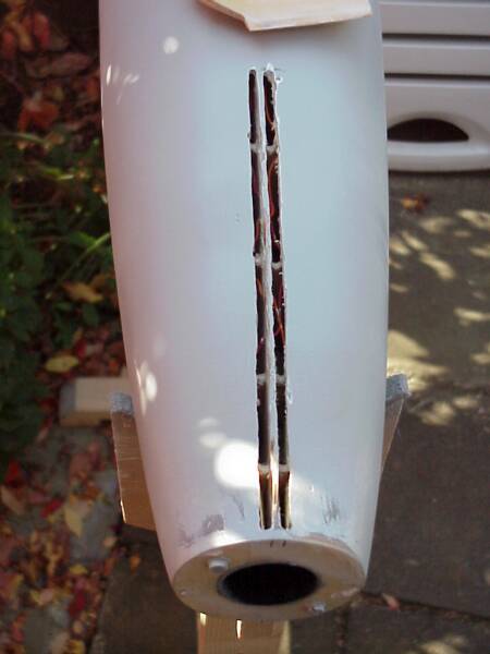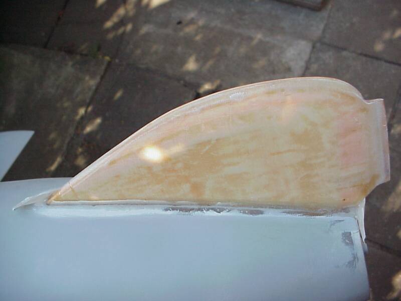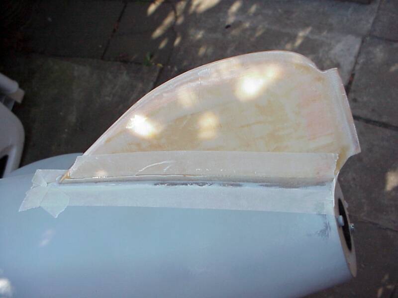 nachdem der "Flügel" mit reichlich Epoxy im Nut eingeleimt wurde, ist in bekannter Manier mit Tape abgeklebt worden und eine Naht ebenfalls mit Epoxy gezogen worden.