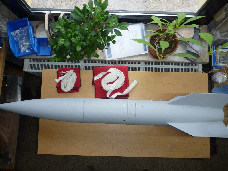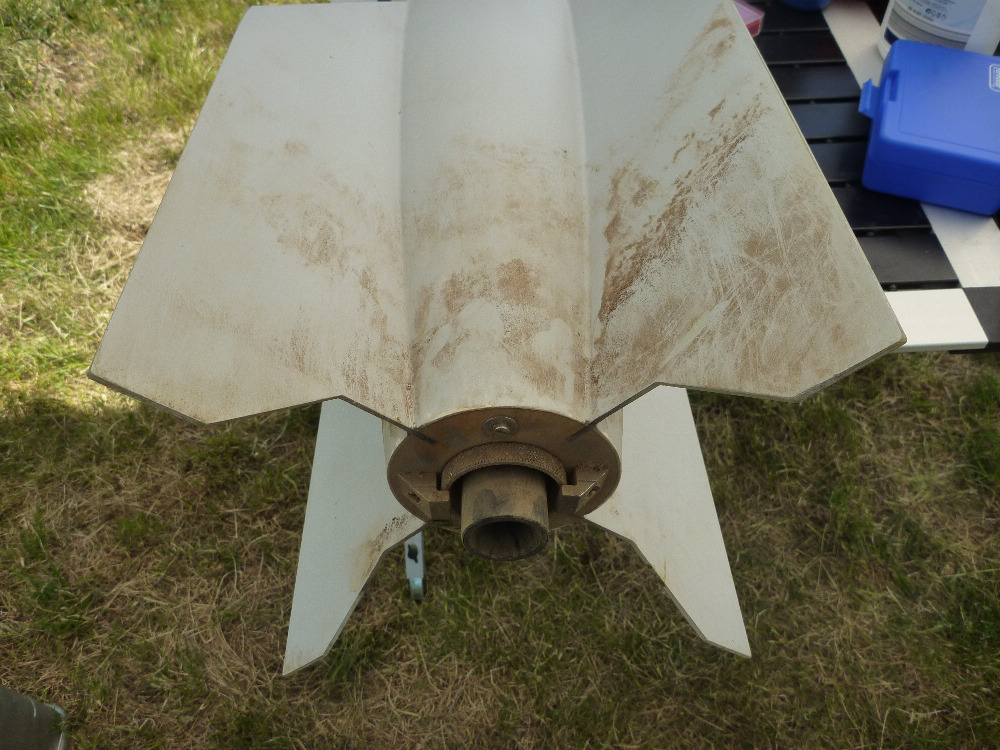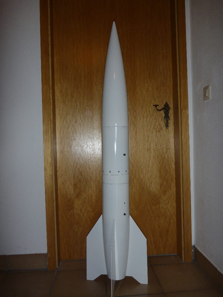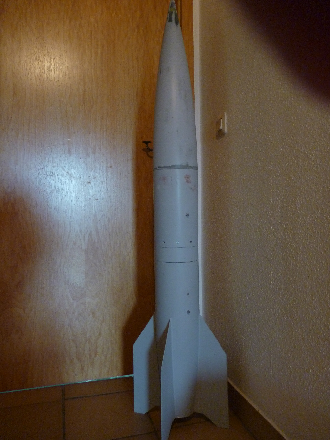 Am 15.5.2015 hat wie geplant der Erststart der P8-A4 in Roitzschjora stattgefunden. Die A4 hat eine Höhe von über 1000 Meter erreicht (ALTIMAX: 1057 m; SALT: 1089 m). In der Simulation waren es knapp 1200 m. Zündung und Start liefen perfekt. Die Flugstabilität war sehr gut. Der gesamte Flug war allerdings leider nur zu 2/3 erfolgreich. Durch nicht ausreichenden Hitzeschutz wurde die Leine zum Heck durch die Ausstoßladung des Motors angeschmort, und ist dann bei der ersten Trennung gerissen. Der Hauptschirm ist schon am Gipfelpunkt aufgegangen und das Heck alleine abgestürzt. Warum sich Spitze und Mittelteil dabei auch getrennt haben und der Hauptschirm aufgegangen ist, kann ich leider nicht nachvollziehen. Die Ausstoßladungen für die Spitzentrennung haben, wie vorgesehen, beim Abstieg in 200 Meter Höhe gezündet. Das konnte man gut beobachten/hören. Obwohl natürlich für solche Zwecke nicht vorgesehen hat sich meine feste Bauweise wenigstens ausgezahlt: Das Heck ist völlig unversehrt runtergekommen: Zur Fertigstellung des Modells steht jetzt noch die Lackierung an. Vorbild ist dabei die Farbgebung des ersten Weltraumflugs im Oktober 1942. Die weiße Grundlackierung ist aufgebracht. Jetzt wird es noch ein bisschen Mühe machen das ganze mit den schwarzen Anteilen der "Tracking-Lackierung" zu vervollständigen: Viele Grüße Dennis